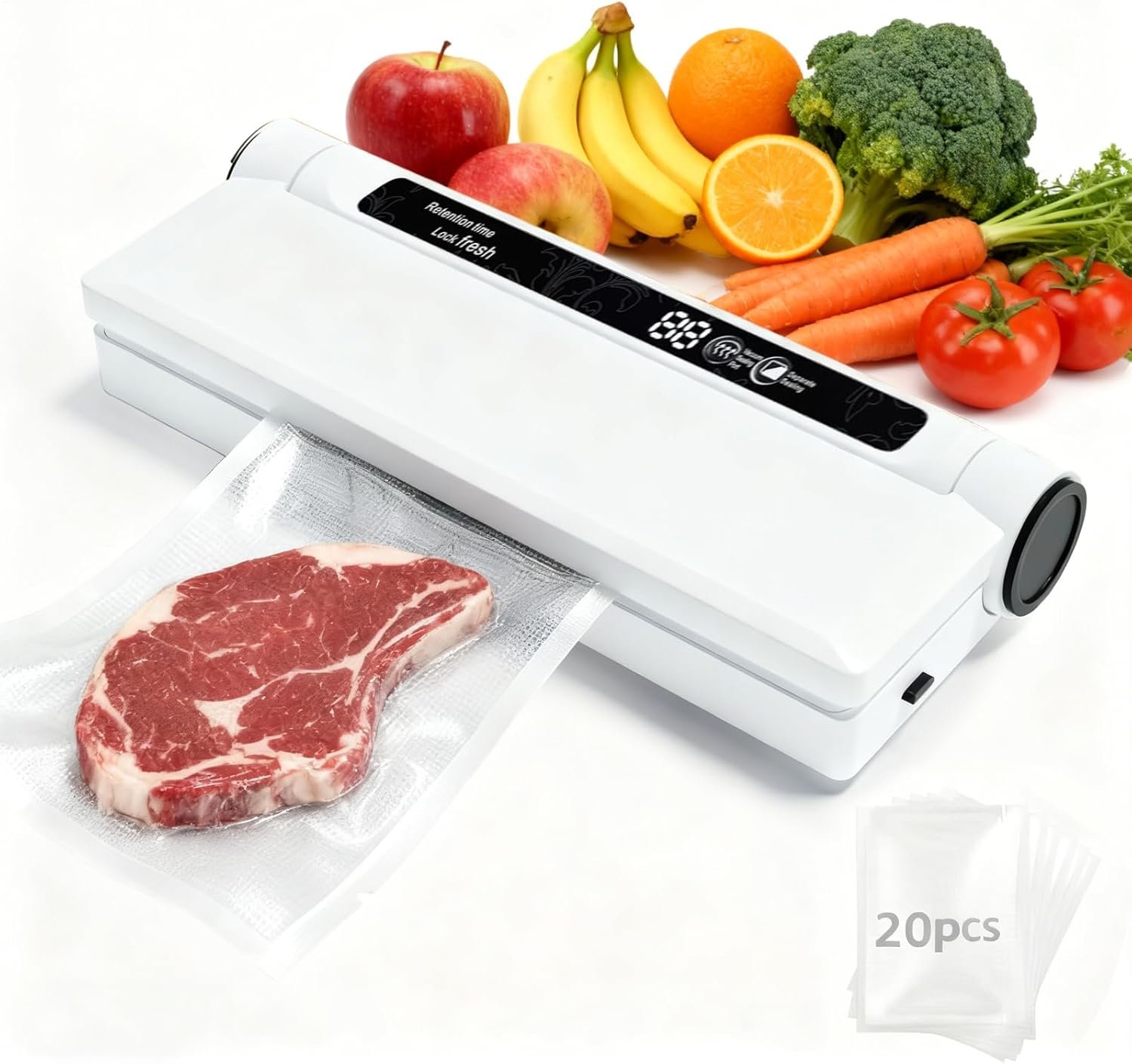 75 kPa Food Vacuum Sealer, Powerful Suction, Dry/Wet Modes for All Food Needs, Low-Temperature Slow Cooking, Countdown Timer, Lightweight and Portable, Includes 20 Sealing Bags, Ideal for Home Use